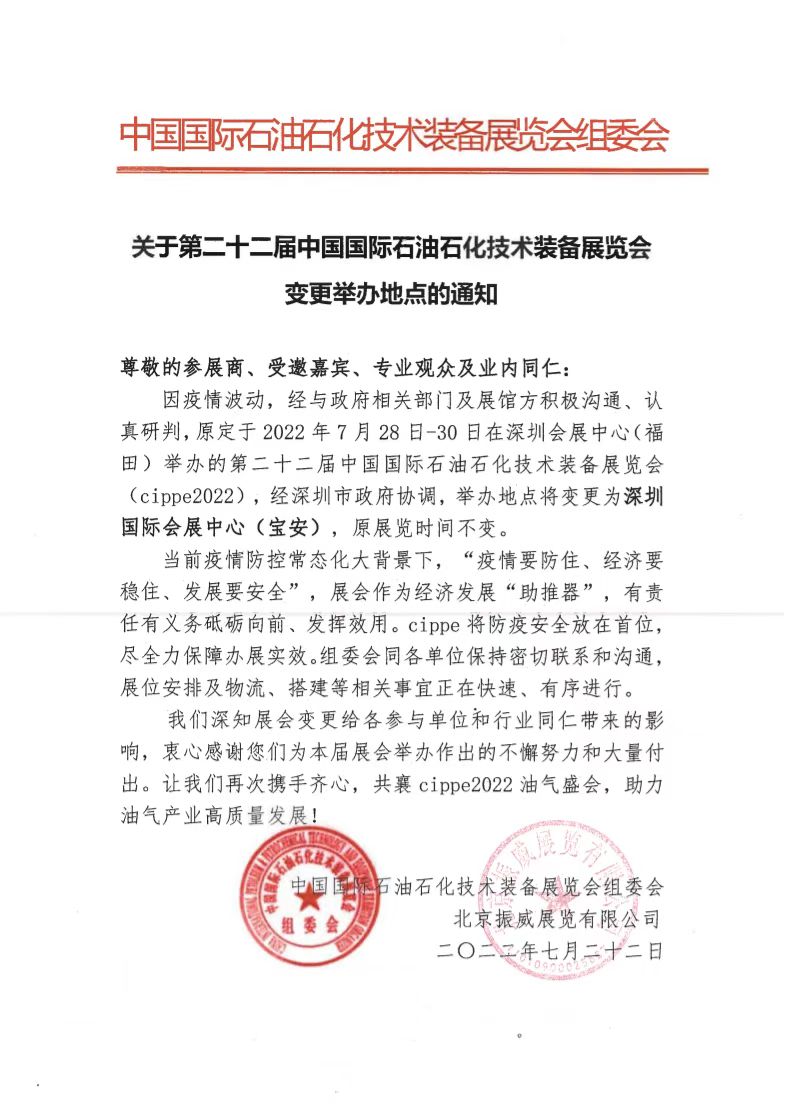 2022-07-28進(jìn)館須知按照深圳疫情防控指揮部及《深圳市會展活動疫情防控工作指引》的各項(xiàng)要求,為切實(shí)維護(hù)參觀商、參展商、搭建商、服務(wù)商、工作人員等所有展會參與人員的健康安全,切實(shí)保障cippe2022振威石油展順利舉辦,所有入館人員(每次進(jìn)館)均須遵守以下防疫規(guī)定,造成不便敬請諒解。1、深圳市地區(qū):粵康碼綠碼+24小時內(nèi)核酸陰性證明方.........【詳情】