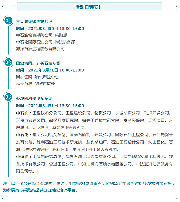 為更好的服務國內外參展商與參觀商,保障企業參展、參會實效。cippe2021將繼續在展會期間舉辦“采購對接會”活動,為參展商與采購商搭建"一對一"油氣對接交流平臺,共享行業頂級資源。歡迎參展商與采購商積極報名參與。