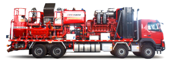 ▲2500型大功率固井車:主要由重載底盤、動力系統、SQP2500EG重型柱塞泵和Super-HIMI大排量混合器組成,是目前陸地功率最大 的固井車、混漿能力比常規固井設備提高76%,可以實現遠程自動控制,適用于深層-超深層油氣井固井施工。