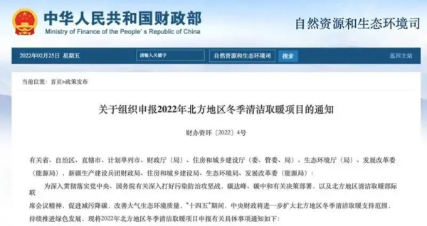 近日,財政部辦公廳、住房城鄉建設部辦公廳、生態環境部辦公廳、國家能源局綜合司聯合發布《關于組織申報2022年北方地區冬季清潔取暖項目的通知》。