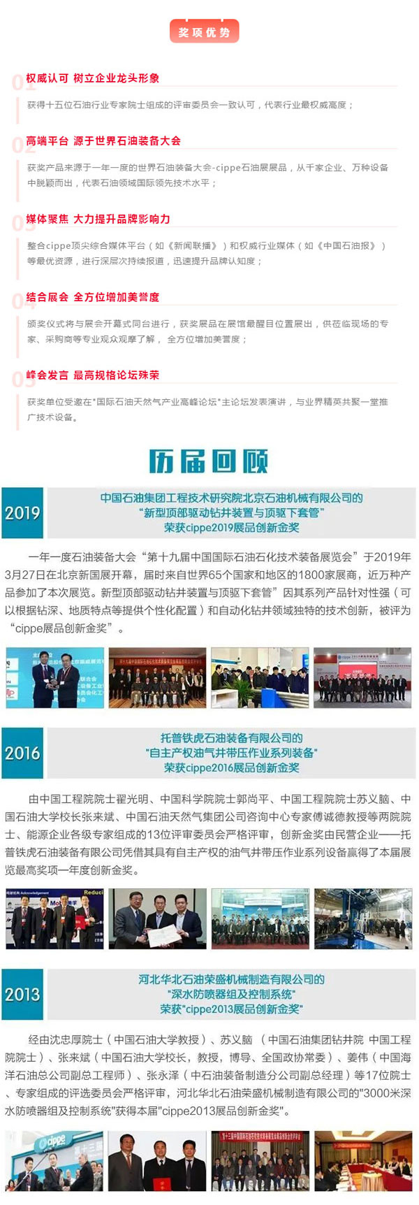 “cippe展品創新金獎”是cippe組委會于2012年推出的展會同期重磅活動,在業內具有極高的影響力。cippe組委會每年都邀請至少15位院士、專家組成評選委員會,從參展企業展出的上萬件展品中嚴格評選出具有自主知識產權、具有重大技術突破、最能代表該領域國際最高科技水平的裝備及技術。“cippe 展品創新金獎”每年都得到千余家國內外參展商的廣泛參與及關注,因其評選的專業性、客觀性、權威性,影響力的廣泛性,被稱為石油領域的“奧斯卡”。